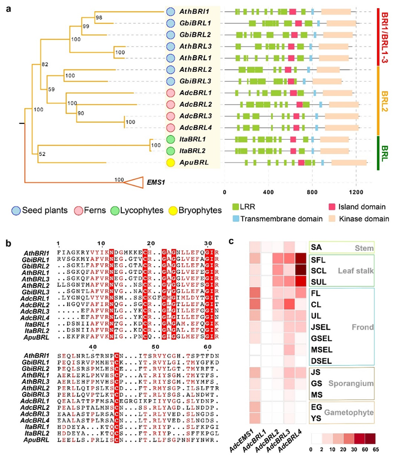 通过对真叶植物各进化节点的祖先基因推断,首次发现真叶植物的最近共同祖先中,BRI1-BRL基因家族出现了明显扩张。研究显示了BRI1-BRL基因家族在真叶植物中发生过两次复制,从而形成了真叶植物共有的BRL2亚家族,以及种子植物中特异扩张的BRL1/BRL1-3亚家族(图2)。铁线蕨BRL2亚家族成员的组织表达分析也验证了这些基因在维管束分布丰富的叶柄和叶片中表达显著。这些结果显示了BRI1-BRL基因家族的扩张很可能与真叶维管系统的起源有关,是推动真叶植物维管系统复杂化进而产生真叶的分子动力。