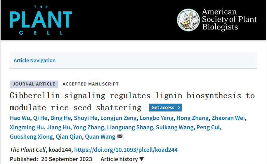 近日,基因组所汪泉团队在《植物细胞(The Plant Cell)》上在线发表了题为“Gibberellin signaling regulates lignin biosynthesis to modulate rice seed shattering”的研究论文。文章揭示了赤霉素信号通过调节离层区木质素含量影响籽粒脱落的新机制。