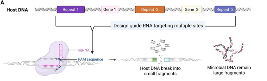 一是利用CRISPR-Cas系统,通过设计靶向宿主基因组重复序列或高拷贝区域的gRNA,Cas9可将宿主DNA切割为短片段(如1-2 kb),而微生物DNA仍以长片段形式保留,适配于后续长读长测序。然而,该策略仍面临技术挑战,包括复杂基因组所需gRNA数量庞大、脱靶风险控制及需避免误切微生物DNA等。