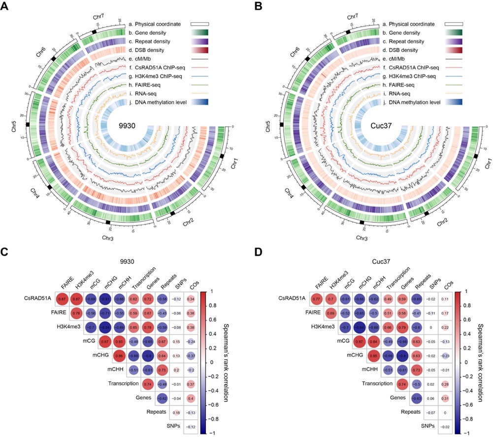 图2. 黄瓜减数分裂重组多组学Circos图和相关系数矩阵