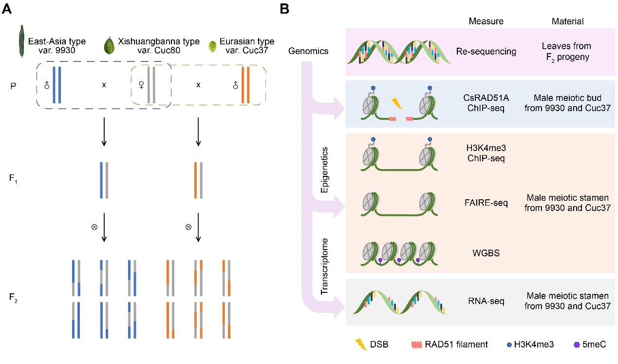 研究人员选择半野生的西双版纳类群黄瓜作为母本,分别与栽培类型的东亚类群和欧亚类群黄瓜进行杂交,获得F1单株,然后自交获得F2群体。收集父本自交系的减数分裂花器官,构建多组学数据集,用于解析影响不同黄瓜材料CO形成的多组学因素(图1)。
