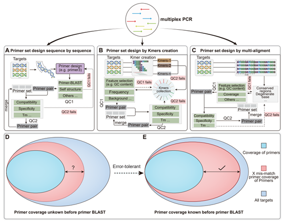 多重PCR靶向测序因其操作简便、成本低和高效富集能力,成为病原体监测的重要工具。然而,其准确性高度依赖引物设计。研究指出,传统的逐条序列引物设计方法耗时长,且容易出现二聚体和非特异性扩增问题。为解决这一难题,科学家开发了基于K-mer和多序列比对的简并引物设计策略,同时引入容错设计模式,允许引物与目标序列存在一定碱基错配,从而实现更高覆盖率和均衡检测效果。这种策略不仅减少了引物数量、提高浓度,还降低了非特异性扩增风险。通过优化简并碱基及错配位置,多重PCR靶向测序在低丰度病原体检测和复杂微生物群落分析中显示出显著优势,为快速、精确的现场诊断提供技术保障。