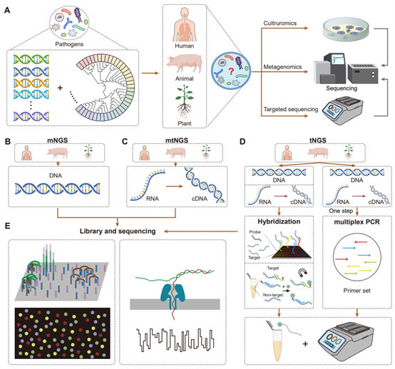 高通量测序技术正在革新病原体监测与诊断方法。通过全基因组测序(WGS)、宏基因组测序(mNGS)、宏转录组测序(mtNGS)以及靶向测序,研究者可以在单一实验中同时获取宿主与微生物的完整信息,实现复杂样本中多种病原体的快速识别。宏基因组和宏转录组测序能够无偏倚地检测已知和未知病原体,同时揭示微生物的活跃状态和群落功能特征,为临床感染、动物疫病以及植物病害的早期诊断提供新手段。靶向测序则通过聚焦特定基因或区域,实现低成本、高灵敏度的病原体鉴定,尤其适用于低丰度或混合感染样本。高通量测序技术的多样化应用,使病原体检测从单一物种识别升级为系统化、多层次的精准监测,为全球公共卫生与粮食安全提供坚实技术支撑。