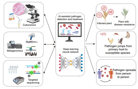 人工智能正在为测序技术注入新活力,显著提升了病原体检测的速度、精准度和可扩展性。AI可优化引物设计、分析复杂微生物组数据,并从宿主主导的核酸信号中提取低丰度病原体信息,实现多重感染的快速识别。在临床和兽医应用中,AI驱动的算法能够实时分析宏基因组和宏转录组数据,追踪新发病原体和耐药基因的传播。在农业领域,AI优化的靶向测序可提高植物病原体的检测特异性,并支持田间实时诊断,帮助农作物早期防控病害。结合便携式测序平台,AI不仅提升实验室内分析效率,也使资源有限或现场环境下的病原体监测成为可能,为公共健康、动物疫病控制和可持续农业提供了革命性解决方案。