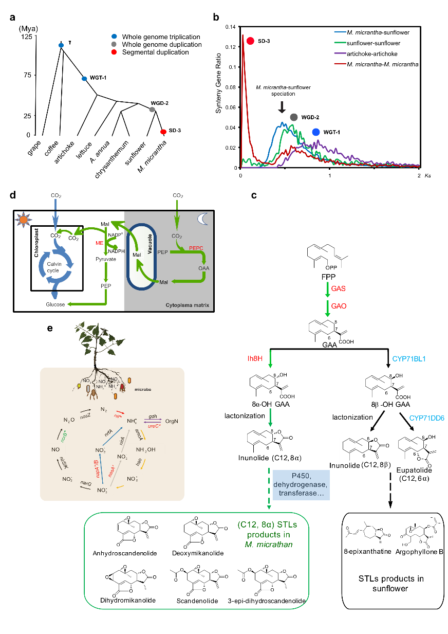 为从根本上解析薇甘菊快速生长和入侵的机制,研究团队构建了染色体水平的高质量薇甘菊参考基因组,利用比较基因组学、代谢组学、转录组学和土壤宏基因组学技术,从薇甘菊的光合作用、化感物质、与土壤微生物作用等几方面揭示了其快速生长和环境适应的分子机制。研究发现,薇甘菊属于C3植物,但可在白天和夜晚分别利用不同的光合途径进行CO2的固定,使其净光合速率接近于C4植物,充足的碳水化合物导致了它的快速生长特性。同时,薇甘菊还可以通过自身的化感物质有效地富集固氮菌和氨化细菌,加速了根际土壤的养分循环,为其快速的生长提供充足养分(图2)。