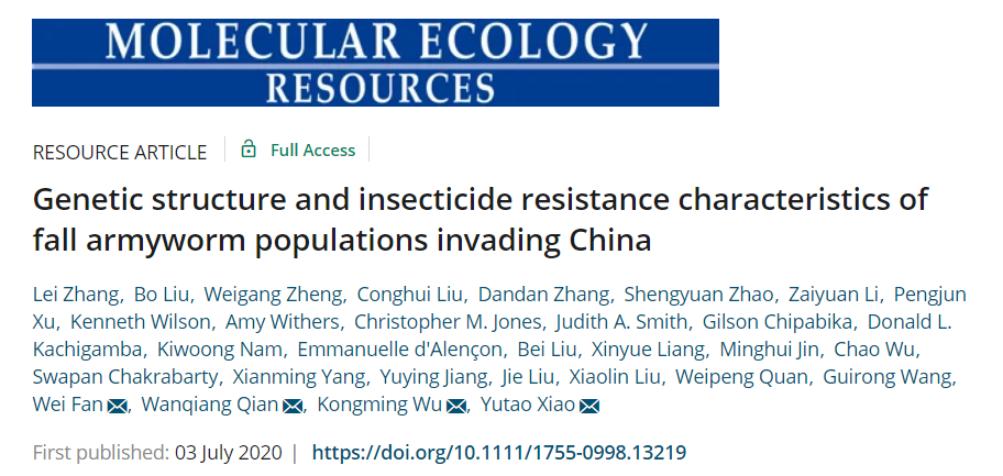 7月3日,国际学术期刊《生态分子资源(Molecular Ecology Resources)》在线发表了中国农业科学院农业基因组研究所(以下简称“基因组所”)萧玉涛团队合作研究成果。该研究通过高深度重测序揭示草地贪夜蛾不同生物型遗传背景差异,并明确了入侵中国的草地贪夜蛾对农药和Bt作物的抗性特征。
