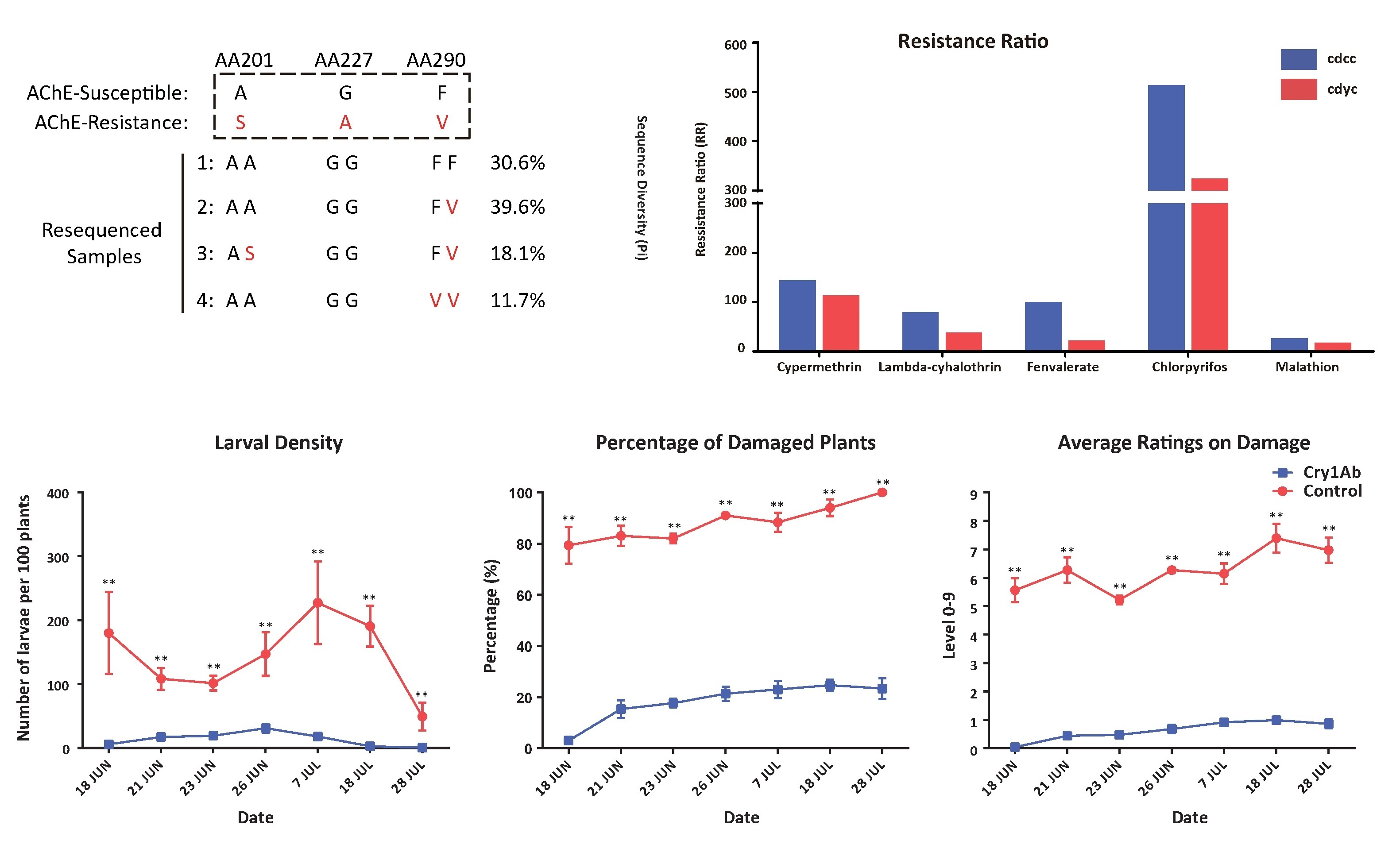 草地贪夜蛾的入侵给我国农业生产造成严重损失,预计未来几年仍会持续造成影响。研究团队通过PacBio、Hi-C等测序技术,构建了一套染色体水平的草地贪夜蛾基因组序列(390.38Mb)。通过对中国103份样品的重测序分析,并与非洲、美洲样品进行比较,揭示了入侵中国草地贪夜蛾为一种以“玉米型”遗传背景为主导的群体。同时,该研究还测定了入侵中国的草地贪夜蛾群体对14种常用农药的敏感性基线,并通过小规模田间试验证实转Bt(Cry1Ab)玉米对草地贪夜蛾具有明显的防治效果。该研究结果对于指导精准选用农药和应用Bt作物科学防控草地贪夜蛾提供了科学依据。