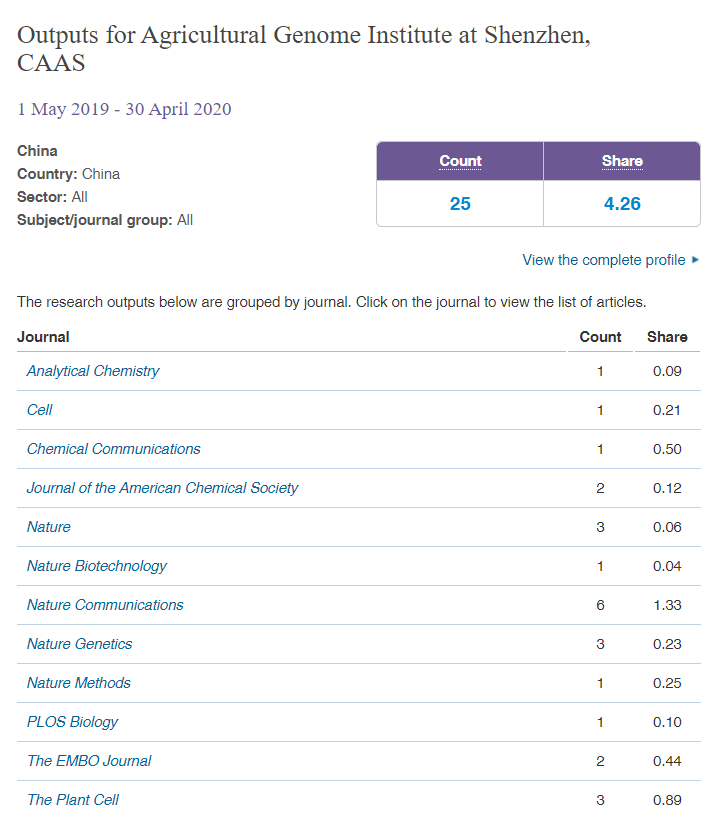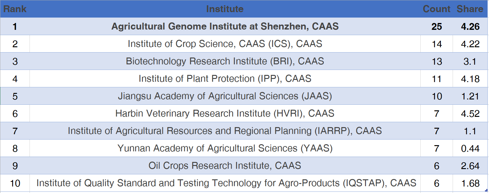 2020年7月5日,Nature 指数公布了最新一期2019年5月1日到2020年4月30日全球大学/机构排名。中国农业科学院位列全国农业类院校/机构第一名。中国农业科学院农业基因组研究所(以下简称“基因组所”)表现出色,位列全国农业类科研院所第一名,其中Count指数25, Share指数4.26。
