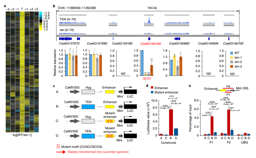 进一步针对人类中增强子结合转录因子—HSF-1和ERα的全基因组结合数据进行分析,研究人员推测,在真核生物中,组蛋白球体区域乙酰化有可能是基因内部增强子表达调控的一个保守机制。该研究成果为揭示转录因子结合到基因内部如何调控基因表达的科学问题提出了新的见解,也为深入认识株型发育的基因调控网络提供了重要的突破,并可直接用于培育轻简化栽培的黄瓜新品种。
