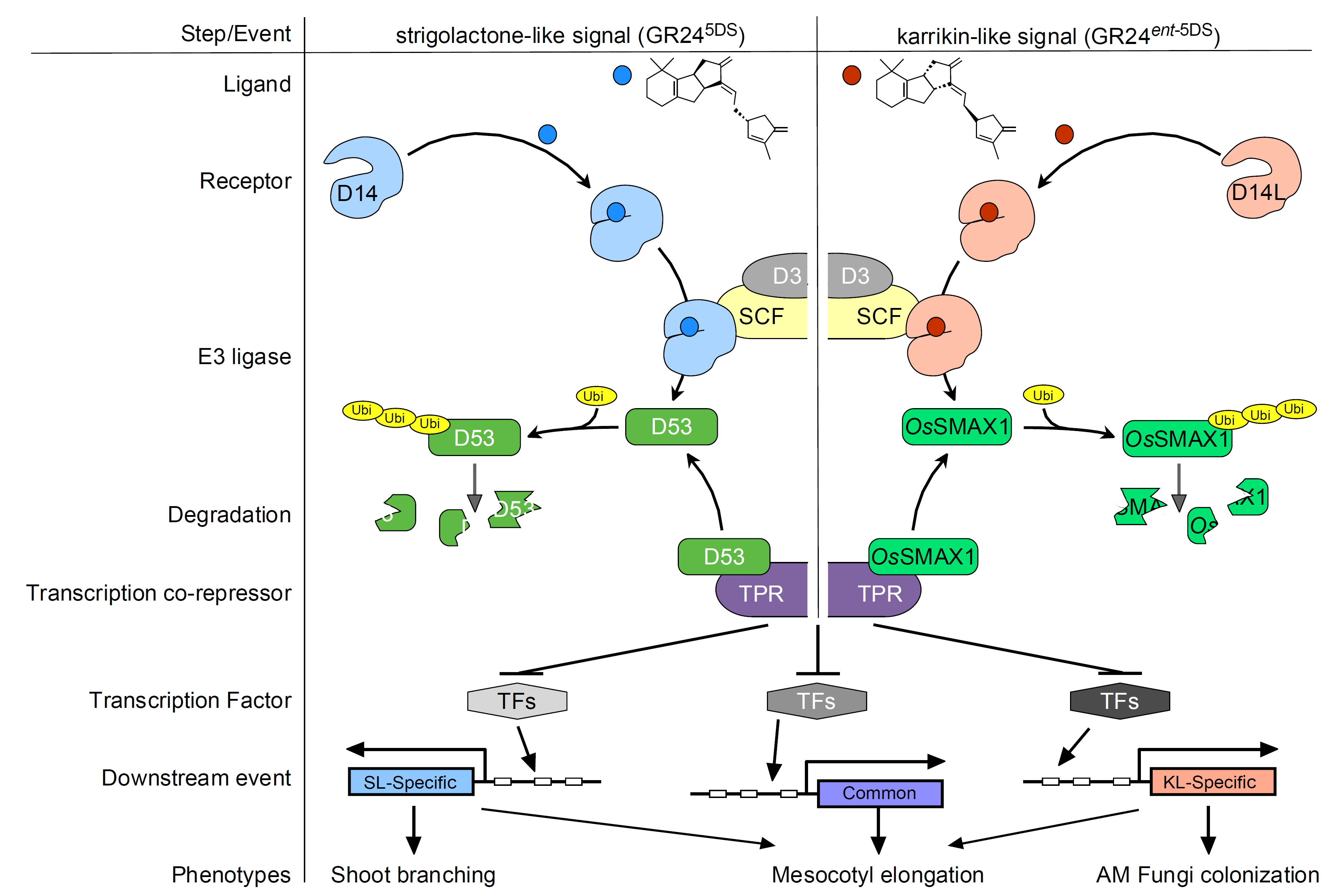 D53与OsSMAX1都能与转录抑制因子TPRs形成复合物,分别抑制SL和KAR信号通路下游靶基因的表达,从而抑制SL或KAR信号通路。当独脚金内酯信号和KAR信号分别被受体蛋白D14和D14L感受时,相应地诱导D53和OsSMAX1被D3泛素化,泛素化的D53和OsSMAX1再通过26S蛋白酶体降解,从而解除转录共抑制因子TPRs对下游靶基因表达的抑制作用,从而,影响受SL信号和KAR信号调控的相应表型。
