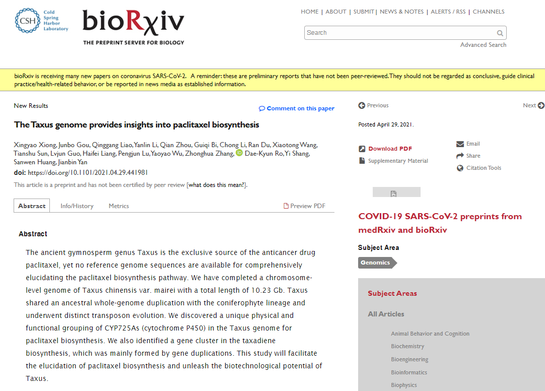 2021年4月30日,湖南农业大学和中国农业科学院农业基因组研究所等单位共同在预印平台bioRxiv在线发表题为“The Taxus genome providesinsights into paclitaxel biosynthesis”的研究论文。