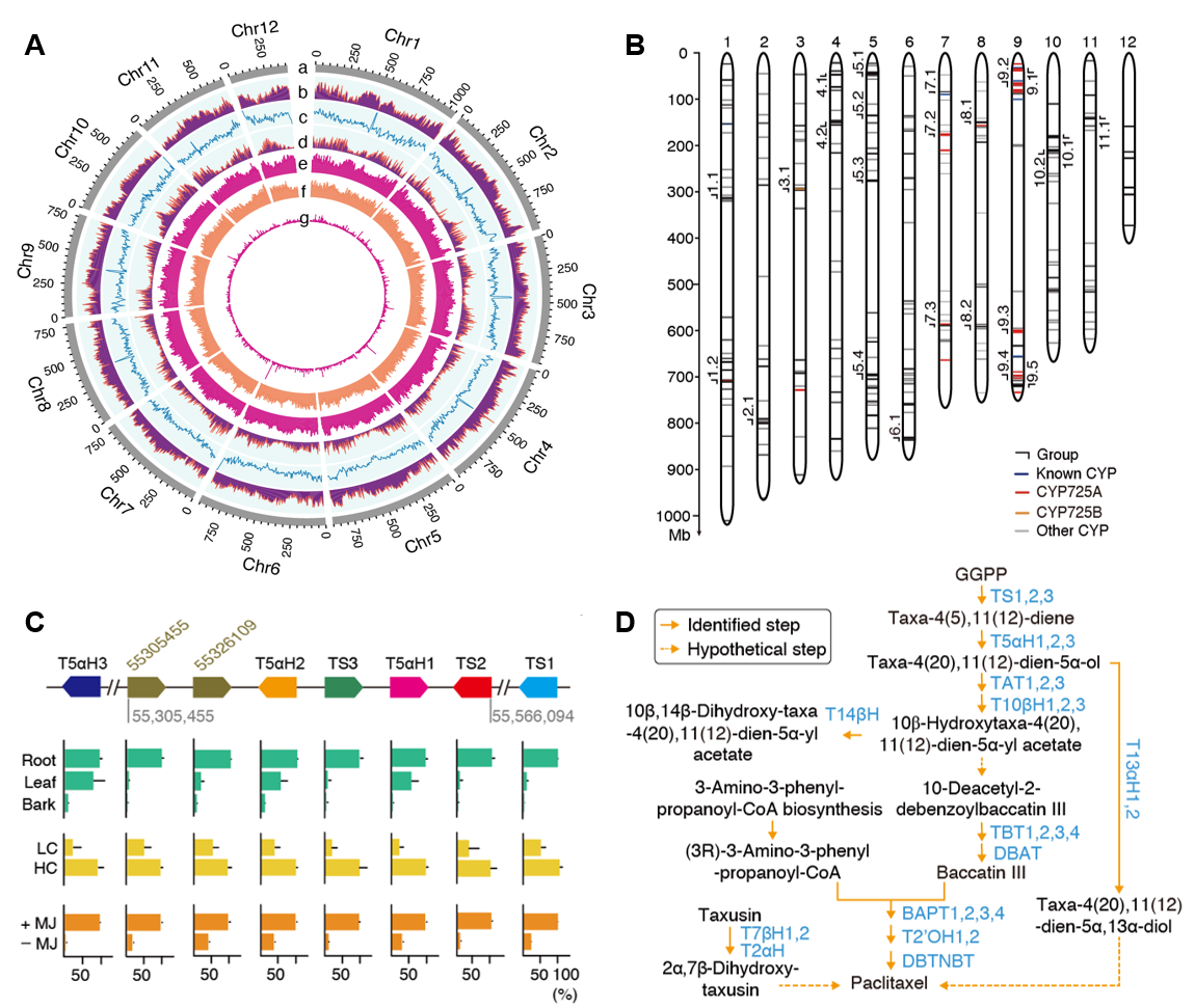 中国农科院基因组所研究团队通过对南方红豆杉(Taxuschinensis var. mairei)单倍型胚乳材料全基因组测序,成功组装了染色体级别的高质量参考基因组。南方红豆杉基因组大小为10.23 Gb,Contig N50为2.44 Mb,其中9.86 Gb的组装数据被挂载到了红豆杉基因组的12条染色体上。研究显示该红豆杉基因组经历了一次古代的全基因复制事件,并且其基因组中的重复序列经历了长期而连续的插入过程。在漫长的进化过程中,红豆杉不仅形成了独特的Gypsy和Copia转座子家族,而且进化出独有的紫杉醇生物合成相关基因家族。该研究系统分析了紫杉醇合成相关基因的基因组定位与协同表达调控,绘制了多个相关基因家族的基因组位置图谱,特别揭示了细胞色素P450家族的基因组分布和调控规律。研究首次发现了紫杉醇合成基因在红豆杉9号染色体上的聚集分布现象,并在其中鉴定了首个紫杉醇生物合成基因簇,由六个基因串联组成,主要负责催化紫杉醇生物合成的前两步。