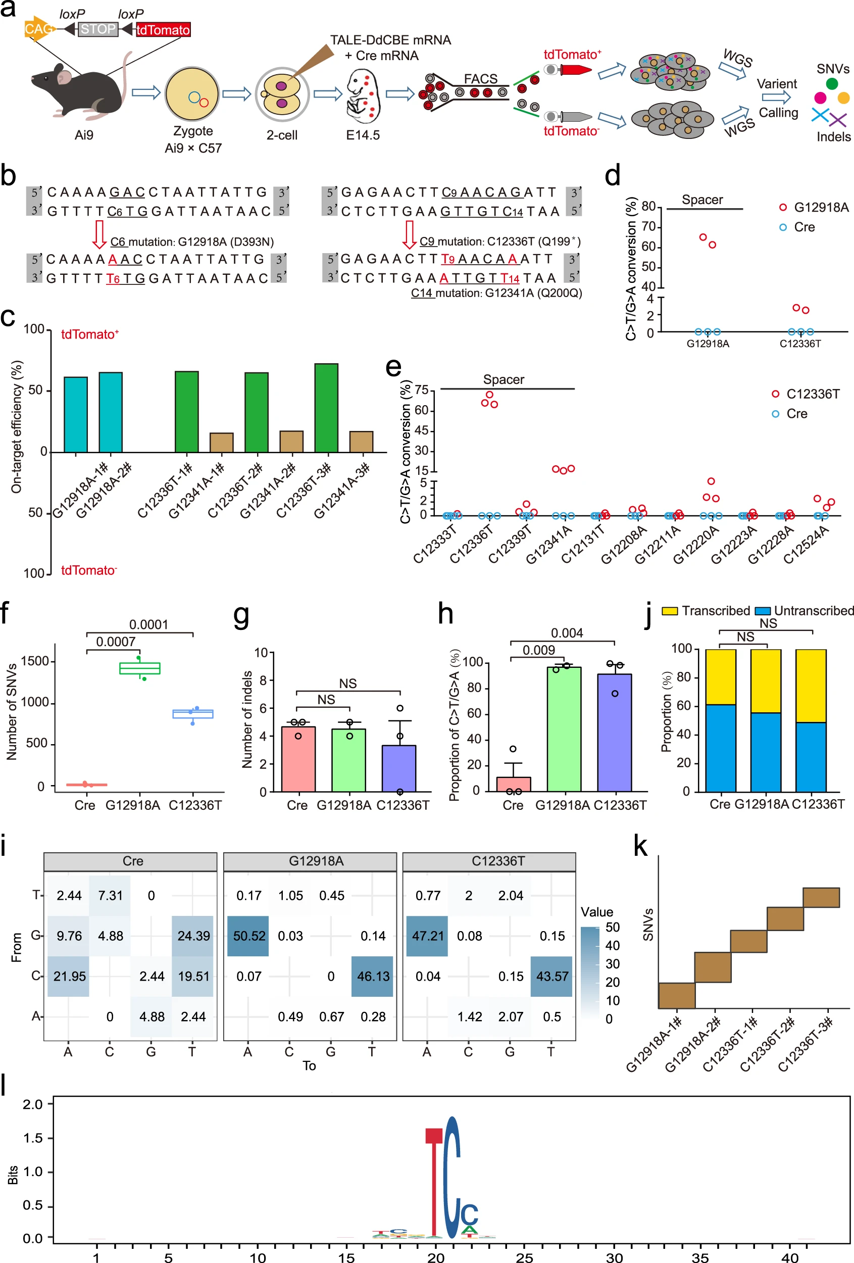 该研究利用GOTI (Genome-wide Off-target analysis by Two-cell embryo Injection),一种脱靶检测技术,分析了线粒体碱基编辑器对线粒体DNA和核DNA的影响,发现其在核DNA上产生了大量的基因组范围内的SNV脱靶效应,在线粒体基因组上发现了频率较低的脱靶。与作用于单链DNA的胞嘧啶脱氨酶APOBEC1不同,线粒体碱基编辑器中的DddA是一种以双链DNA为底物的独特类型的胞嘧啶脱氨酶。这也许解释了线粒体碱基编辑器比CBE更多的SNV脱靶效应的原因。理论上,线粒体碱基编辑器会在N端线粒体靶向信号的引导下进入线粒体,然而结果表明,在哺乳动物细胞中,MTS不能阻止DdCBE进入细胞核,以致于其在核基因组上产生了严重的脱靶效应。