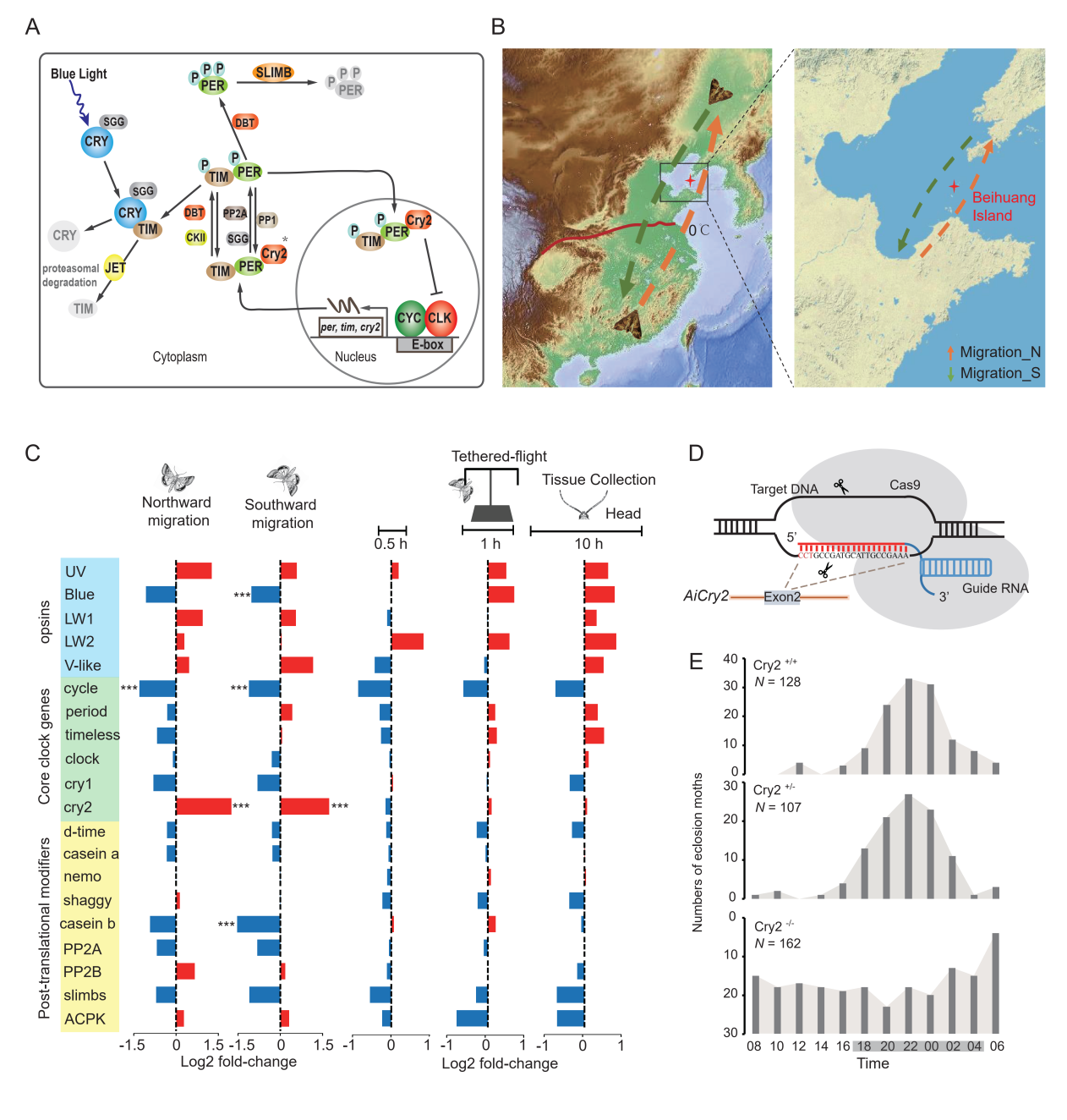研究人员通过位于渤海湾的北城隍岛对小地老虎南迁期和北迁期的飞行状态成虫进行灯光诱集,对成虫的头部和腹部分别取样进行转录组测序。同时,对室内群体采用吊飞的方式模拟不同飞行时间。对迁飞-吊飞的成虫头部转录组进行比较分析发现,隐花色素Cry2MagR基因的表达在迁飞群体显著升高,而在吊飞群体中无显著变化。推测Cry2MagR高表达在迁飞过程中具有重要作用。进一步通过CRISRP/Cas9技术对Cry2基因进行敲除,发现敲除个体羽化时间紊乱,生物钟节律被打破。