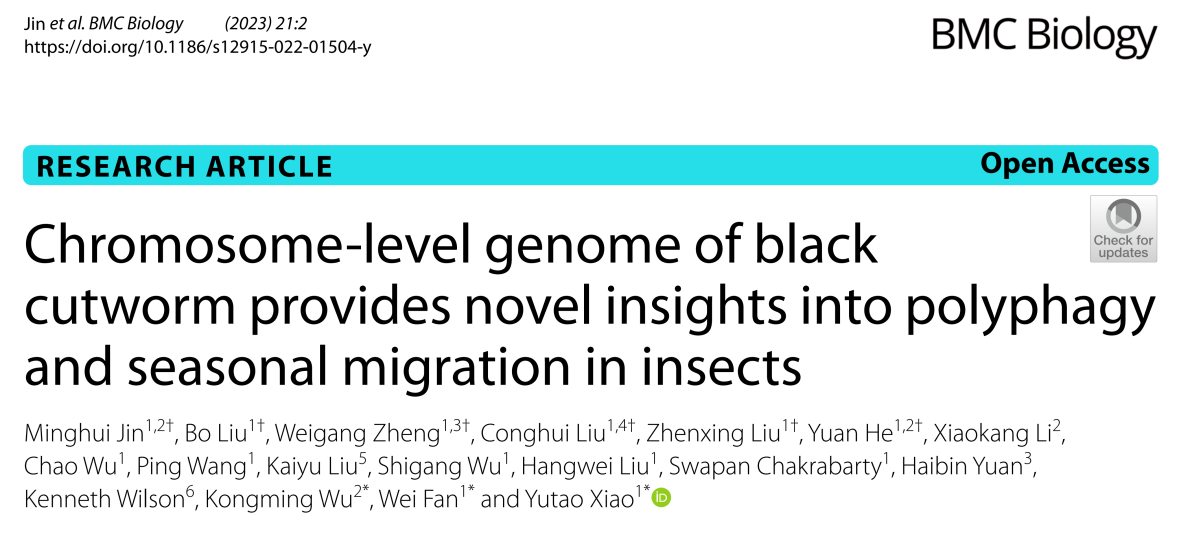 近日,基因组所萧玉涛团队和樊伟团队联合中国农业科学院植物?;ぱ芯克?,在国际知名生物学杂志《BMC生物学(BMC Biology)》上在线发表了题为“Chromosome-level genome of black cutworm provides novel insights into polyphagy and seasonal migration in insects”的研究论文。研究发布了小地老虎染色体水平基因组,通过组学和实验相结合的方式,对小地老虎杂食性和远距离季节迁飞等行为机制进行了解析,研究发现小地老虎通过不同的代谢酶抵御多样化的植物次生物质,揭示了节律通路、激素合成通路以及能量代谢通路在昆虫远距离迁飞中的重要作用。该研究为害虫绿色防控提供潜在靶点,并促进了对害虫远距离迁飞适应性的理解。