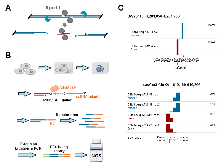 在真核生物中,减数分裂是有性繁殖所需的一个基本过程。减数分裂过程中,Spo11诱导程序性DNA双链断裂(Double-strand break, DSB),Spo11诱导的减数分裂DSB可分为三部分:DNA断裂上游末端、DNA断裂下游末端和Spo11结合的寡核苷酸,其中DNA断裂上下游末端均为3’悬臂结构形式(图1A)。减数分裂重组使得同源染色体之间的遗传物质交换,从而极大地促进了遗传多样性。绘制精细的减数分裂DNA双链断裂图谱,对人们了解减数分裂同源重组机制至关重要。