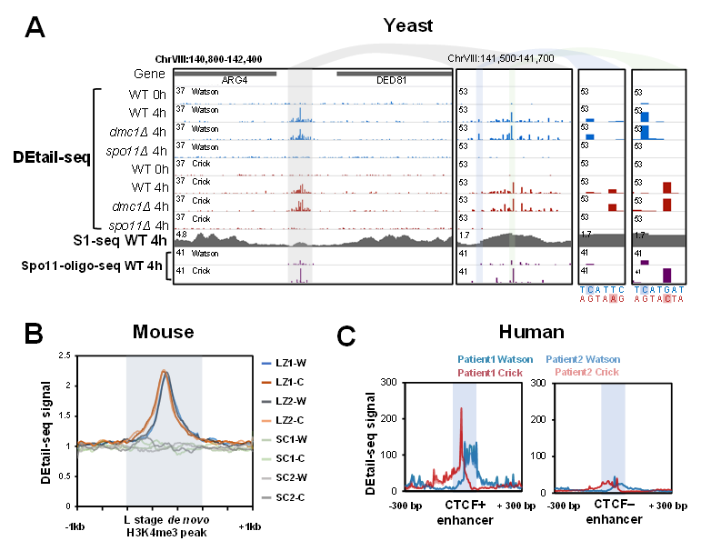 研究团队利用DEtail-seq技术在酿酒酵母(图2A)、小鼠(图2B)以及人类生殖细胞(图2C)中成功检测到减数分裂DNA断裂的基因组分布,并发现了减数分裂DSB的一系列新特征。小鼠数据的分析结果显示,细线期/偶线期的减数分裂DSB信号富集于细线期新生成的组蛋白H3K4me3修饰位点(图2B)。人类数据的分析结果显示,减数分裂DSB信号富集于含CTCF的增强子区域(图2C)。