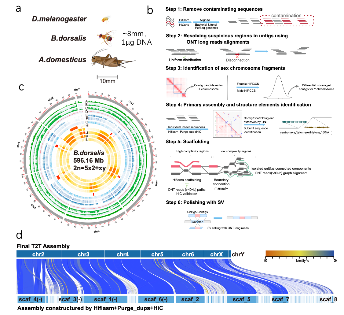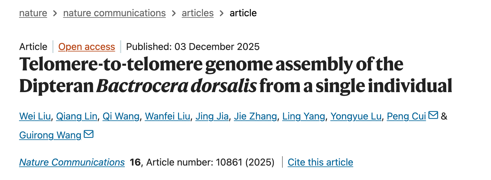 2025年12月3日,中国农业科学院深圳农业基因组研究所(岭南现代农业科学与技术广东省实验室深圳分中心)王桂荣课题组联合崔鹏课题组在《自然·通讯(Nature Communicaions)》上发表题为“Telomere-to-telomere genome assembly of the Dipteran Bactrocera dorsalis from a single individual”的研究论文,该研究以“果蔬杀手”橘小实蝇为研究对象,成功构建了在小个体高杂合害虫中最完整的基因组图谱,并在Y染色体区域和气味受体基因家族进行了潜在绿色农药分子靶标挖掘与验证。研究证明了小昆虫能够迈入T2T基因组时代,为基于害虫功能基因组学手段的防控分子靶标发现以及实蝇类害虫的绿色防控技术研发提供了新思路。