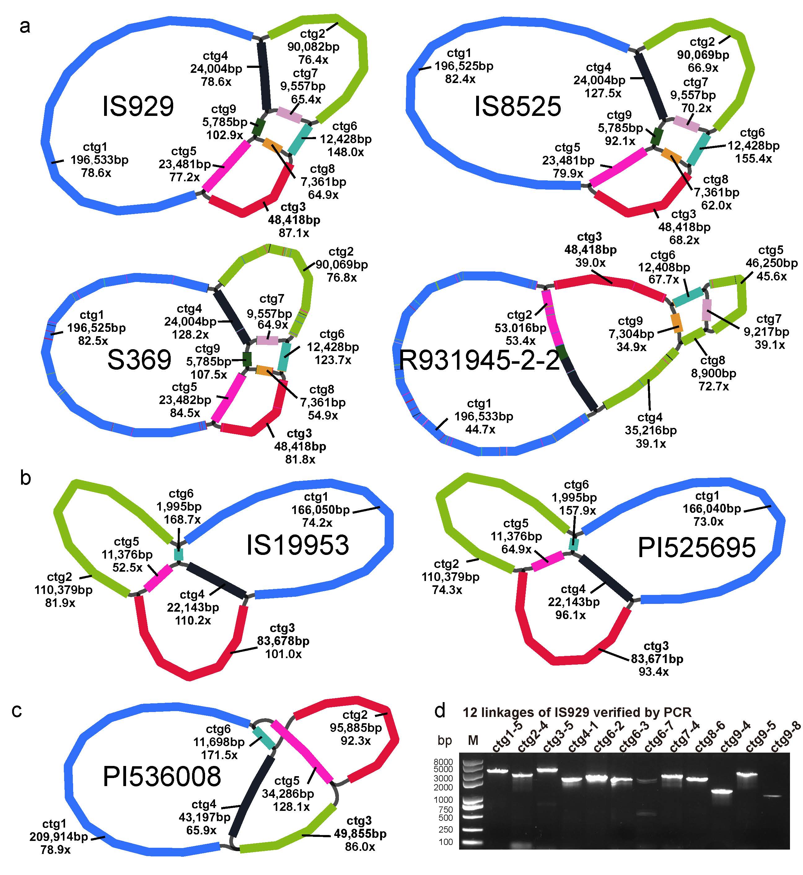 研究人员利用已发布的高粱三代CLR和二代Illumina全基因测序数据,组装得到了六个高粱栽培种(Sorghum bicolor)种质和一个近缘物种(Sorghum propinquum)的线粒体和叶绿体基因组。根据线粒体基因组构象,这七种高粱材料可分为三种类型(如图1 abc),通过比较基因组学方法,研究发现线粒体基因组结构类型与栽培高粱在东非和西非的两次独立驯化事件相关。
