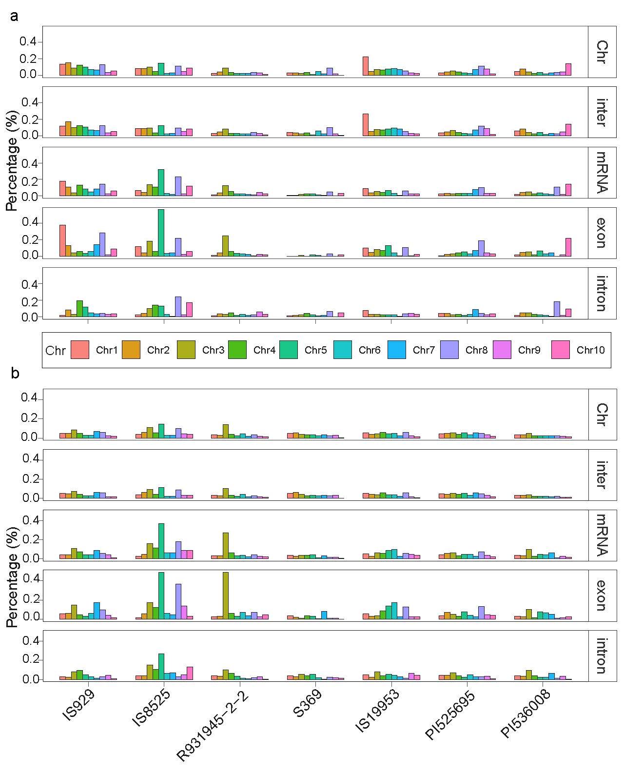 植物细胞内序列从细胞器基因组到核基因组的转移频繁且连续发生,是理解细胞内基因组间协同进化的关键。该研究对细胞核内线粒体DNA序列(NUMTs)和细胞核内叶绿体DNA序列在染色体各区域的分析进行研究(图2 ab),发现在不同材料间这些转移序列在染色体各区域有不同的富集模式。尽管大量研究表明细胞器转移的序列在核内染色体上是无活性或无功能的,但存在例外,其中一些有功能的转移序列对细胞代谢和基因组进化有影响。