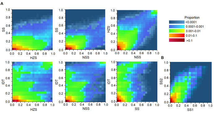 研究人员对120份杂交种中有害突变频率进行分析,发现当轻微有害突变的频率较低时,SNP位点更有可能是杂合的,符合互补作用对杂种优势的解释。选用不同的育种群体的材料作为亲本进行杂交,更有利于杂种优势发挥作用。为了探索这一假设在分子遗传上的证据,研究人员评估了玉米不同的育种群体(硬杆stiff stalk、非硬杆non stiff stalk、iodent和黄早四)的材料的联合位点频谱,结果发现6对育种群体的联合位点频谱之间呈现不对称分布:当轻微有害等位基因在一组中以高频率出现时,在另一组中往往会以低频率出现。这表明用不同育种群体作为亲本产生的杂交种可能存在轻微有害突变的互补效应。而对来自同一育种群体的自交系进行随机取样时,观察到联合位点频谱为对称分布,这表明父母本都来自于同一育种群体的杂交后代具有较弱的互补作用(图3)。