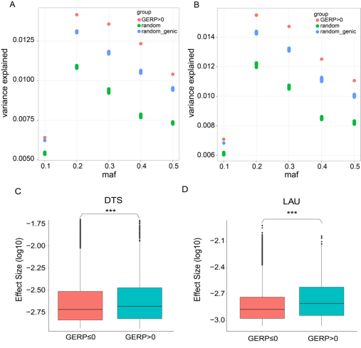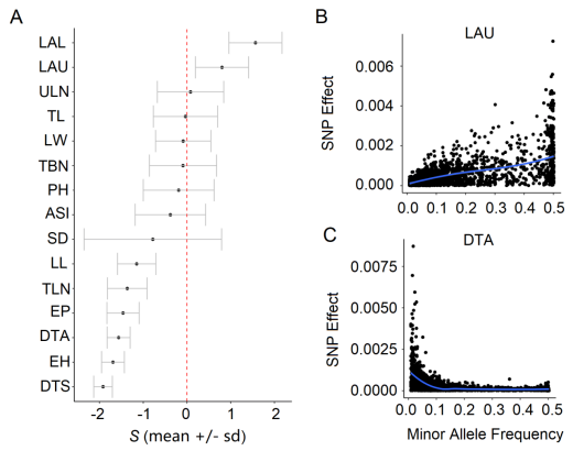 有害突变往往会影响农艺性状。该研究发现,在玉米中,当次等位基因频率(minor allele frequency)相同时,有害突变比中性突变对表型性状的变异解释度更高,特别是与叶夹角和开花时间相关的性状(图3)。相较于中性突变,有害突变对性状影响的更大效应是否与选择的方向性有关呢?研究人员利用贝叶斯方法同时估计了350个自交系群体中每个性状的遗传结构参数,结果表明两个叶夹角性状处于正选择状态,而与开花时间相关的性状处于负选择状态。无论在正选择还是负选择下,有害突变都比中性突变表现出对性状更强的效应,说明有害突变的效应大小与性状选择的方向无关(图4)。