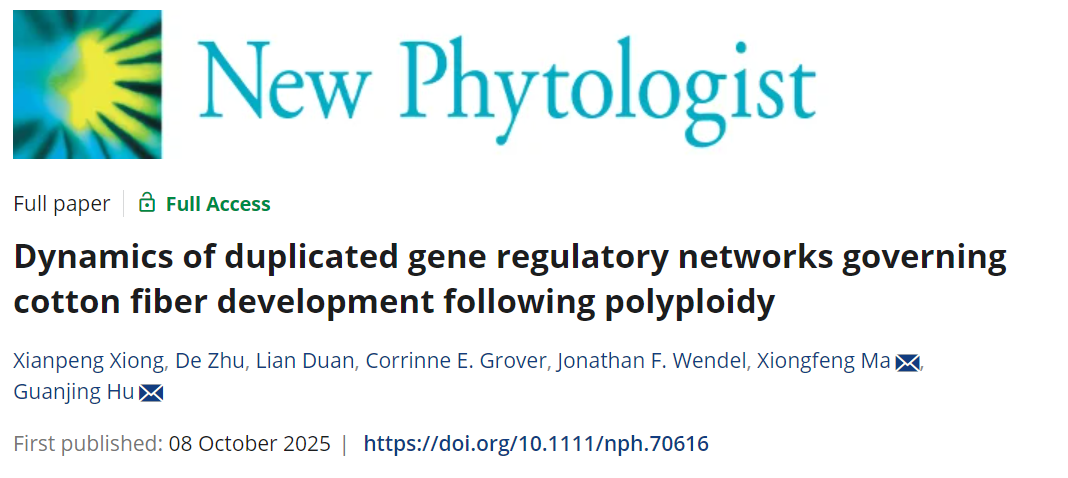 2025年10月8日,《新植物学家(New Phytologist)》在线发表了中国农业科学院深圳农业基因组研究所(岭南现代农业科学与技术广东省实验室深圳分中心)胡冠菁团队与中国农业科学院棉花研究所马雄风研究员团队题为“Dynamics of duplicated gene regulatory networks governing cotton fiber development following polyploidy”的研究论文。该研究不仅系统绘制了控制棉纤维发育的复杂基因调控网络,还揭示了亚基因组不对称性在纤维发育过程中的新规律,并从共表达和 GRN 视角为纤维发育和多倍体功能基因组学提供了新的视角。