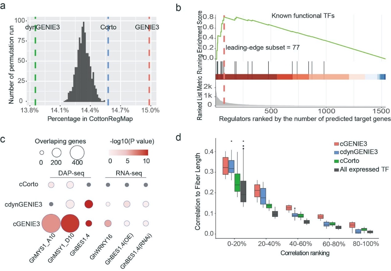 为了破解这一难题,该研究整合来自10项已发表的RNA-seq数据,经过严格的质控,构建了一个包含401个高质量样本的棉花纤维转录图谱,涵盖纤维伸长(初生壁合成)、初生壁向次生壁转换和次生壁加厚在内的3个关键时期。利用这些数据,研究人员首先通过加权基因共表达网络分析,识别出与纤维发育不同阶段密切相关的共表达模块。随后,运用三种不同的基因调控网络(GRN)构建方法,构建了全基因组层面的转录因子到其靶基因的GRN。为了确保网络构建的可靠性,研究人员通过5种方法进行严格验证,包括与基于拟南芥同源关系推导的已知调控图谱进行比对、利用DNA亲和纯化测序技术(DAP-seq)直接鉴定转录因子靶基因,分析已发表的基因敲除或过表达转录组数据和群体表型相关性分析,证明了基于随机森林的机器学习方法GENIE3在GRN构建中具有最高的可靠性。