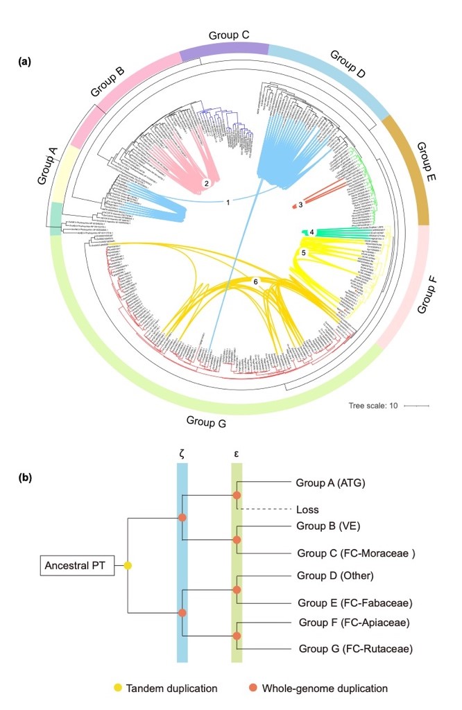 呋喃香豆素类在被子植物中主要分布在四个科:伞形科、桑科、芸香科和豆科。该论文系统研究了呋喃香豆素合成路径中的限速酶prenyltransferase (PT) 基的进化历史。通过分析PT基因从苔藓植物到被子植物的演化历史,阐明PT基因重复的时间和机制,表明呋喃香豆素合成在伞形科、桑科、芸香科和豆科中独立进化。该研究结果为呋喃香豆素合成在被子植物中的进化机制提供了重要的见解。