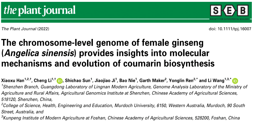 近日,基因组所王丽课题组组装完成了首个伞形科当归属重要药用植物当归的染色体级别参考基因组序列,解析破译了当归调气养血奥秘,为伞形科植物进化提供了新见解,揭示了镇痛补血主要成分—香豆素类化合物的合成和进化机制。相关研究成果发表在《植物杂志(The Plant Journal)》上。