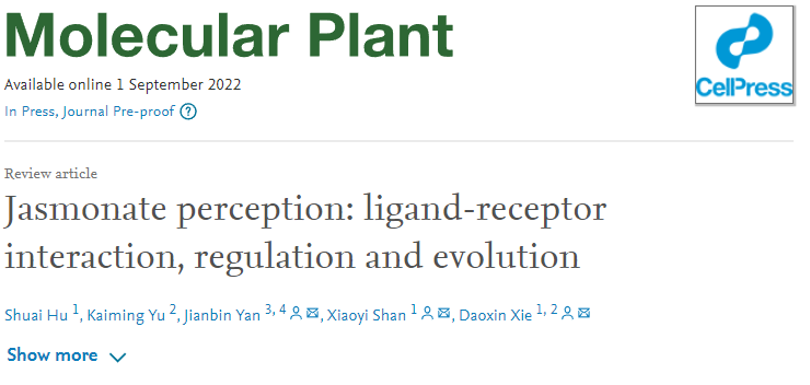 Hu, S., Yu, K., Yan, J., Shan, X., and Xie, D. (2022).Jasmonate perception: ligand-receptor interaction, regulation and evolution. Mol Plant, (accepted).