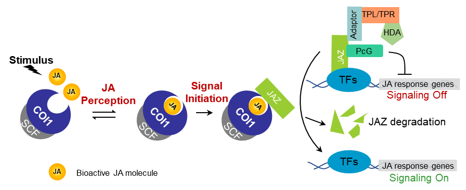 环境或发育因子刺激植物合成JA活性分子,COI1感知JA活性分子后形成平台招募底物(如JAZ蛋白),并使底物泛素化修饰而降解,释放转录因子,开启JA调控的植物反应。JA不积累时,JAZ结合多种共抑制子(如TPL/TPR、HAD、PcG等)抑制JA信号。