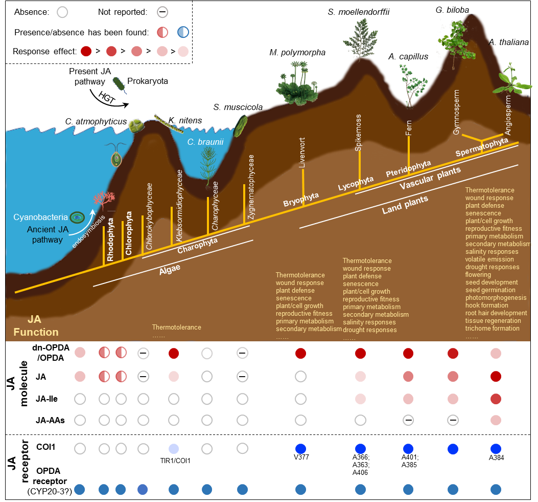 文章最后综述了茉莉素及其感知机制从原核生物至高等植物中的演化过程。茉莉素起源于原核生物,植物登陆以前可能不依赖COI1感知茉莉素,登陆后则以COI1为受体的茉莉素感知机制才出现;COI1所感知的茉莉素活性分子由dn-OPDA逐渐向以茉莉酸-异亮氨酸(JA-Ile)为代表的茉莉酸-氨基酸偶联物(JA-AAs)演变,在植物适应陆生环境中可能发挥重要作用(图3)。