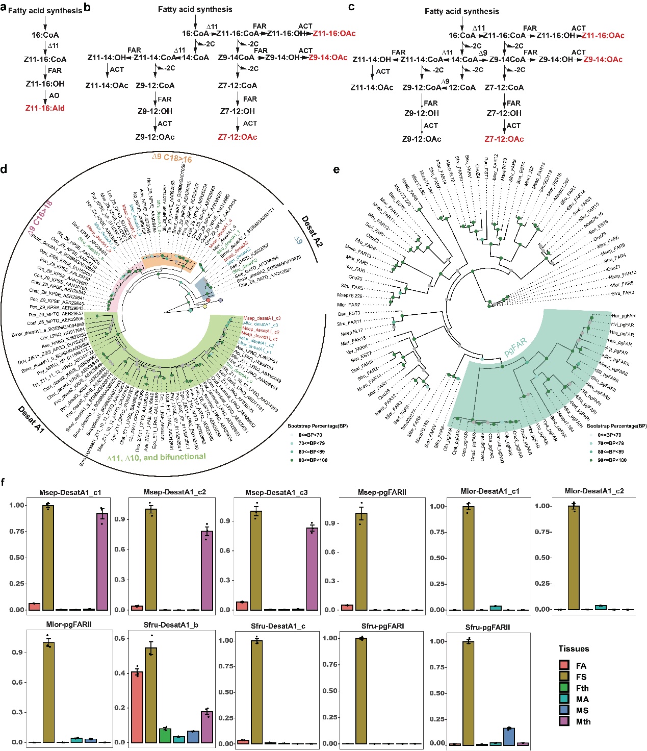 图2 | 东方粘虫、劳氏粘虫和草地贪夜蛾性信息素合成通路和关键的基因