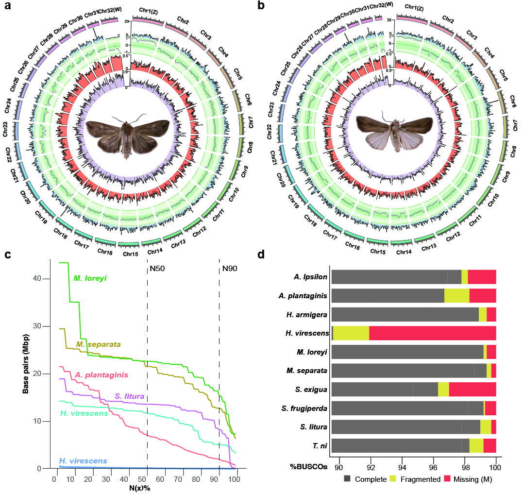 研究团队利用三代测序技术构建了包括 W染色体在内的东方粘虫和劳氏粘虫的参考基因组。东方粘虫和劳氏粘虫的基因组序列总长分别为688.38 Mb和683.22 Mb,分别含有17,549和16,977个蛋白质编码基因。W染色体上包含少量的基因和大量的转座子序列。转座子序列的扩张导致两种粘虫具有较大的基因组。两种粘虫在大约10.5百万年前发生了分化,染色体结构仍然保持稳定。