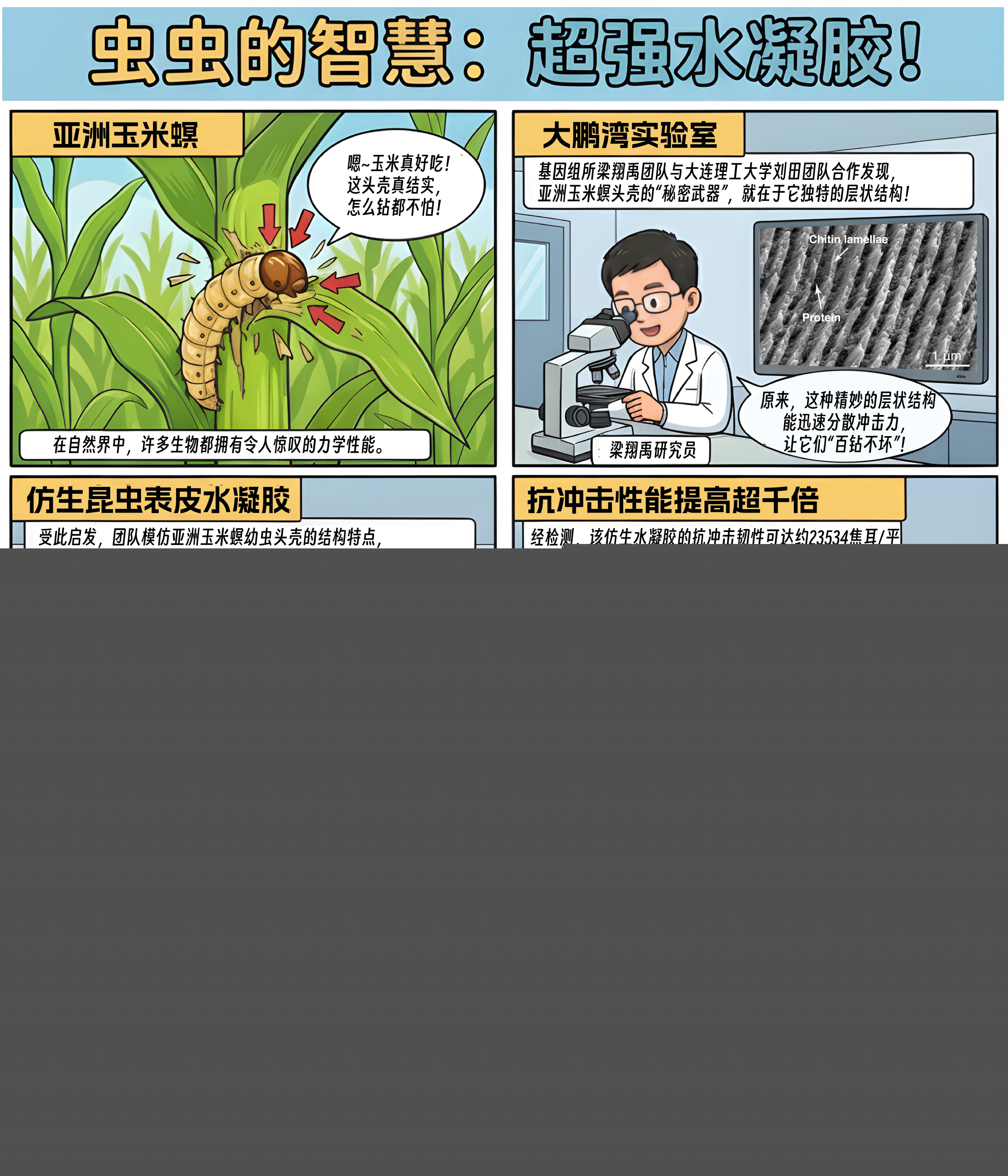 近日,中国农业科学院深圳农业基因组研究所(岭南现代农业科学与技术广东省实验室深圳分中心)梁翔禹团队与大连理工大学刘田团队合作,在国际材料学权威期刊《先进材料(Advanced Materials)》上发表题为“A Protein-managed Hydrogel Biomimicked by Insect Cuticle Enabling Ultra-durable Impact Resistance”的研究论文。该研究受亚洲玉米螟启发,研制出新型仿生层状蛋白-几丁质水凝胶,经检测,该仿生水凝胶的抗冲击性能比传统蛋白质或几丁质水凝胶提高了超千倍。