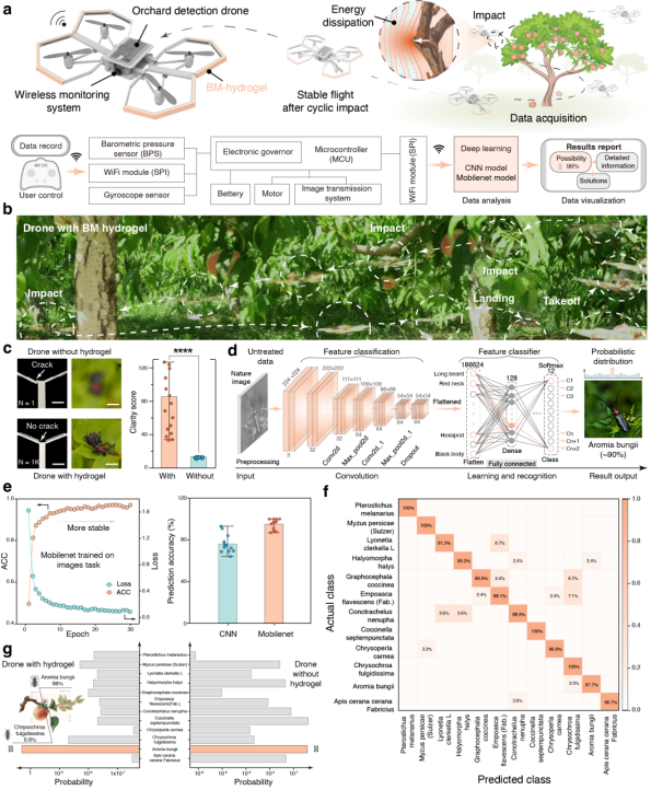 最后,研究团队将仿生耐冲击BM水凝胶装配到农业害虫侦查无人机防撞支架上,构建“防撞+识虫”一体化平台(图5a)。在森林果园等布满树枝和障碍物的复杂环境中,以约4 m/s 进行连续碰撞飞行测试时,未装配BM水凝胶的无人机在首次碰撞后即失稳下坠、支架受损,而装配仿生耐冲击BM水凝胶的无人机仅出现短暂姿态波动后便恢复稳定飞行,机体结构完好,整体图像清晰度得分提高至85.4±33.0,约为裸机的6倍(图5b、c)。在此基础上,研究者利用碰撞工况下采集的图像训练并验证卷积神经网络和轻量化MobileNet V2模型,结果表明在多类果树害虫识别任务中仍保持较高识别准确率与鲁棒性(图5d-g),进一步证明该BM水凝胶在频繁撞击和强干扰环境下既能有效?;せ?,又能保障数据质量和识虫性能。