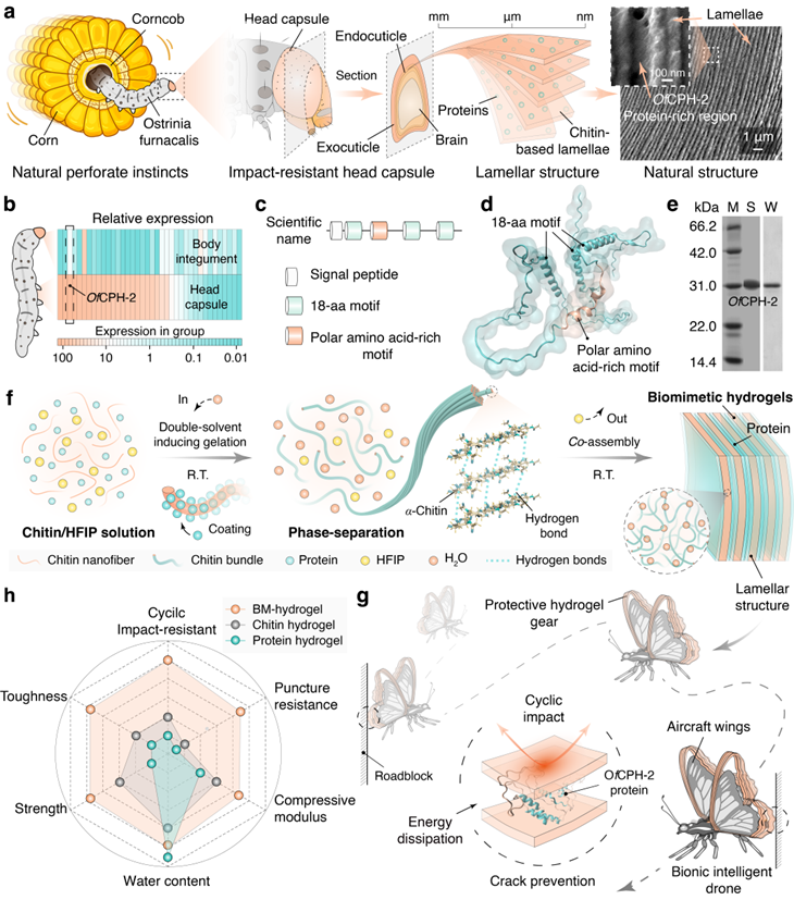 研究团队系统解析了亚洲玉米螟头壳内层表皮的蛋白组成(图1a-e),锁定高丰度表皮蛋白OfCPH-2,并在体外实现高效表达与纯化。研究人员采用二元溶剂诱导自组装策略(图1f),将OfCPH-2与几丁质协同构筑出仿生层状水凝胶,由于多尺度能量耗散机制协同作用,实现材料的抗冲击性能提升至约23534 J·m(-2),比传统蛋白质或几丁质水凝胶提高逾千倍。进一步的测试表明,这一仿生层状蛋白-几丁质水凝胶在循环冲击条件下具有显著的能量耗散与性能稳定性,可作为轻质耐冲击材料应用于仿生飞行器等智能农机装备(图1g)。