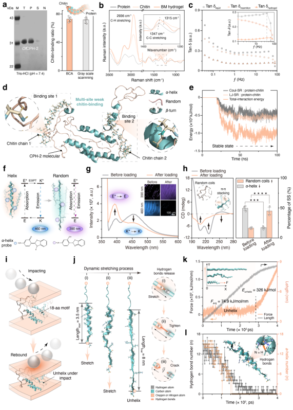 进一步地,研究团队从多尺度揭示了BM水凝胶的能量耗散机制(图4)。首先,OfCPH-2 可在水相中特异结合几丁质,并与其协同形成稳定的层状结构(图4a、b)。其次,流变测试表明材料在不同频段下依次发生氢键和疏水作用的破裂,体现多级相互作用参与耗能(图4c)。分子动力学模拟进一步显示蛋白可在多个位点弱吸附几丁质链,稳定构筑整体骨架(图4d、e)。同时,循环冲击会促使蛋白α-螺旋逐渐解折叠,通过断裂氢键进一步耗散能量(图4f–l)。这些机制共同赋予BM水凝胶卓越的耐冲击与疲劳性能。