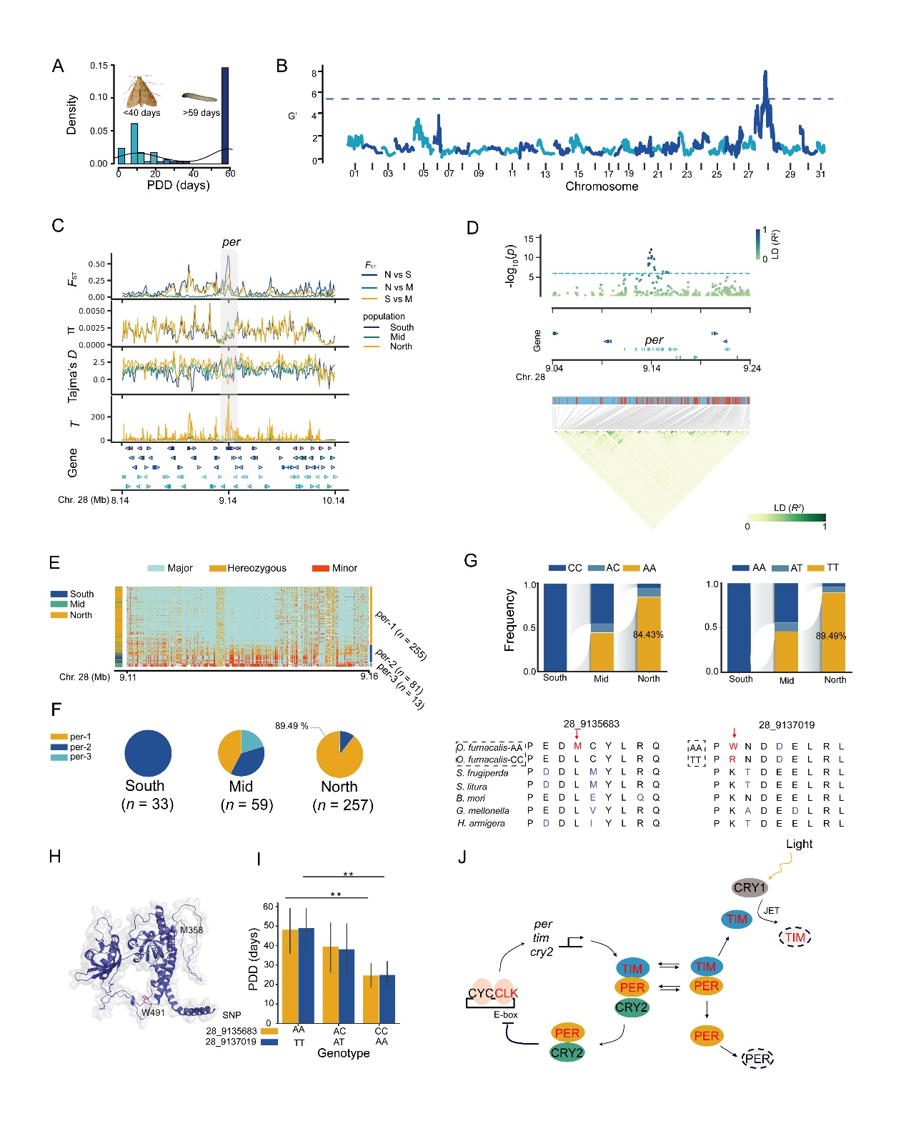滞育是生物体受环境的诱导,发育到某一阶段停滞生长和发育以度过不良生活环境的一种生理状态,是昆虫重要的环境适应性机制。研究通过选择清除分析和环境关联分析,发现节律相关的通路对其滞育的调控起着重要作用,进一步通过遗传分离实验,鉴定到一个控制滞育发生的主效基因位点per,该基因突变后,会改变亚洲玉米螟对光周期的敏感性,从而调控滞育的发生和解除。