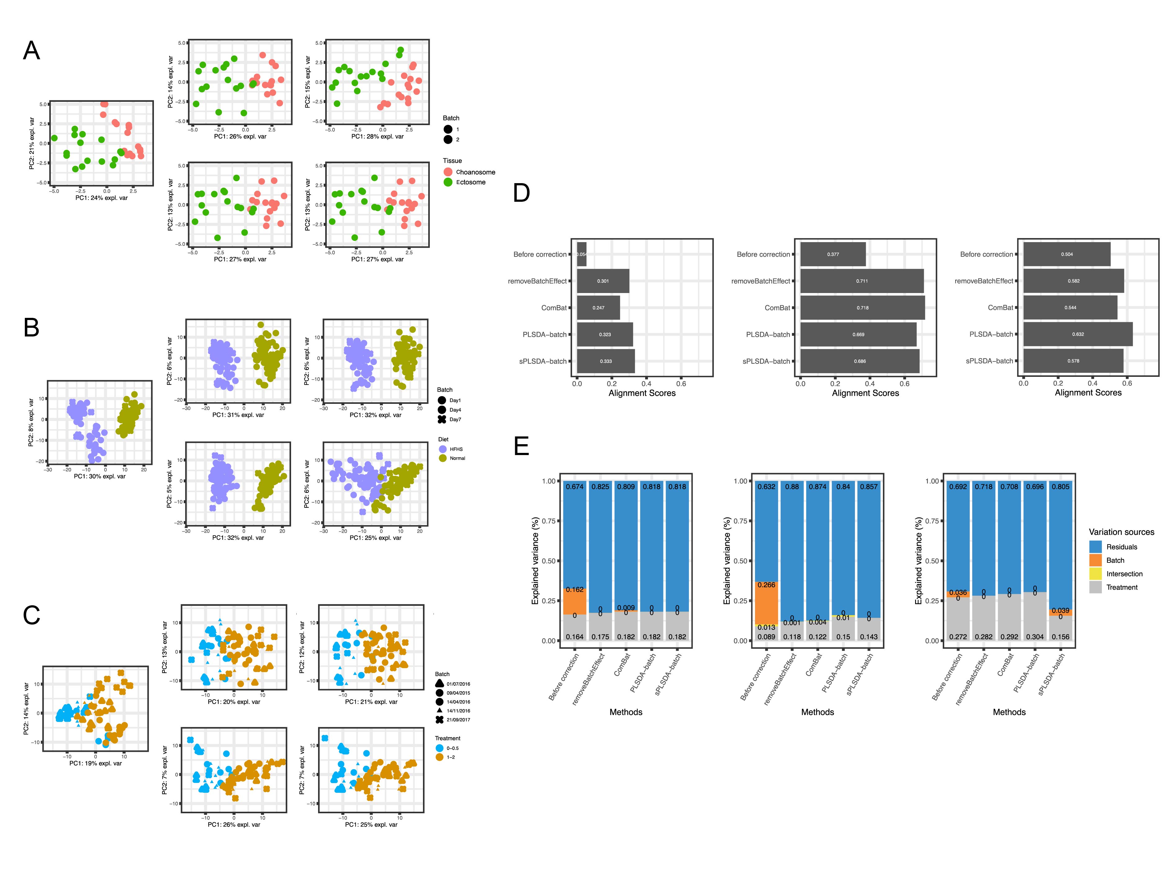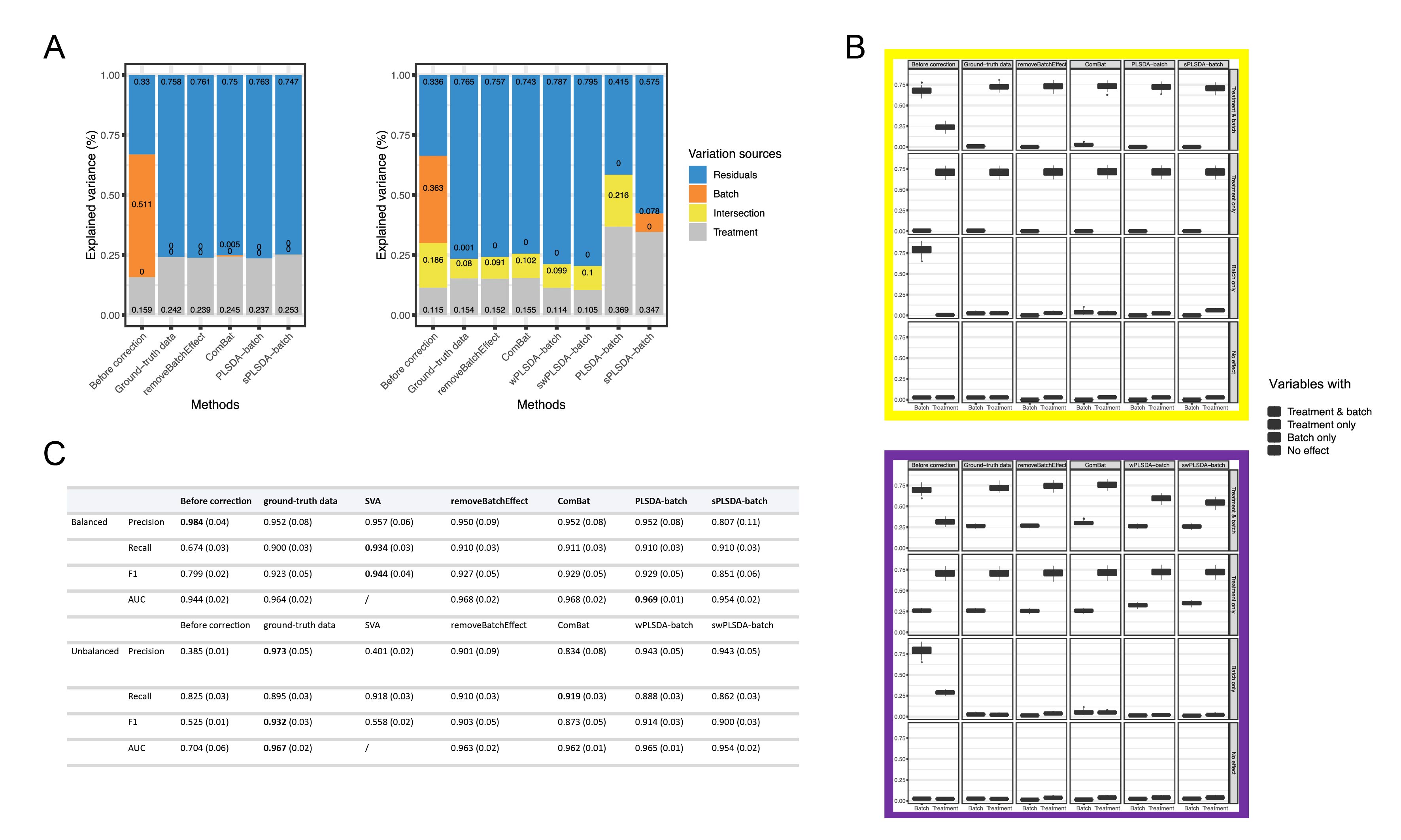 为了验证方法的有效性,研究人员先在模拟数据集上测试了PLSDA-batch,并与常用的removeBatchEffect、ComBat和SVA这三种方法进行了比较;然后在三个实际数据集上,与removeBatchEffect、ComBat这两种方法进行了对比。