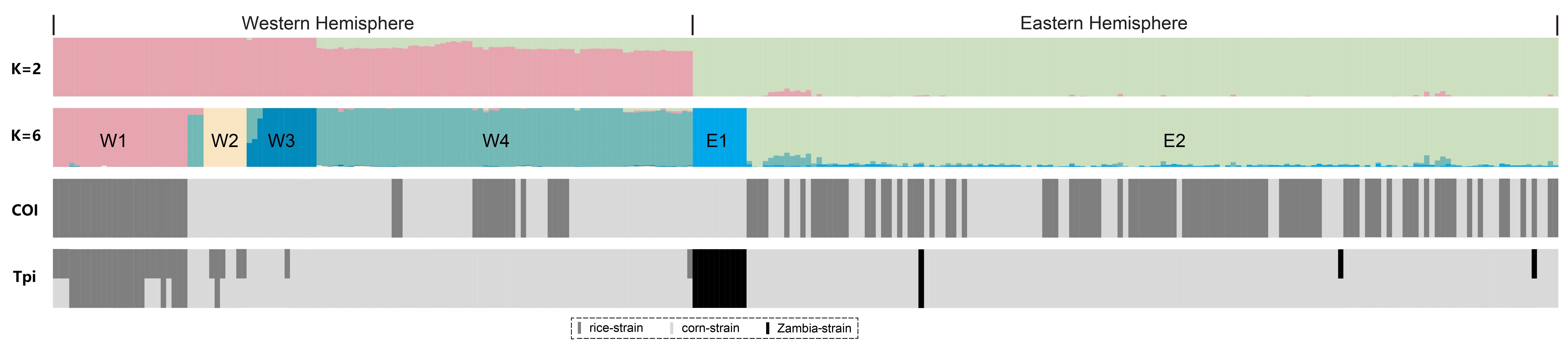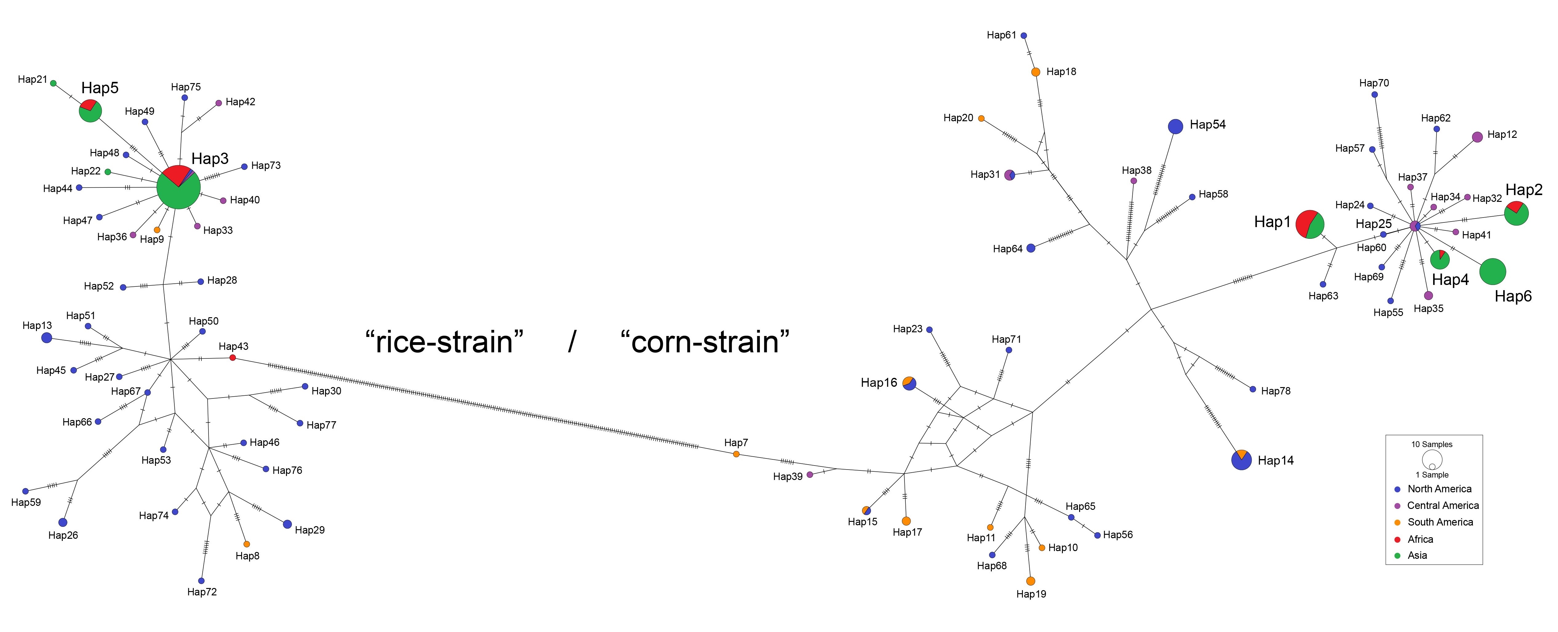 研究人员对153份入侵地样品(东半球:非洲、亚洲)和127份原产地样品(西半球:北美、中美、南美)开展比较分析。群体遗传结构显示入侵地样品与原产地样品区分开,其中原产地样品呈现出高度分化,但是整体上依然存在两个相对独立的遗传群体(美洲“水稻型”和美洲“玉米型”),且群体分化与Z染色体磷酸丙糖异构酶基因(Tpi)高度关联。入侵地田间种群遗传组成表现出明显的同质性,符合短期内从非洲至亚洲的扩散传入模式。