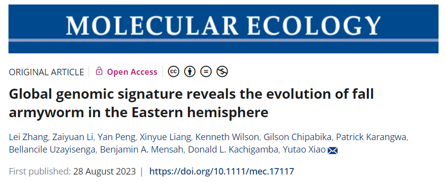 近日,基因组所萧玉涛研究团队联合英国兰卡斯特大学和非洲多个研究机构,在生态学领域知名期刊《分子生态学(Molecular Ecology)》上发表了题为“Global genomic signature reveals the evolution of fall armyworm in the Eastern hemisphere”的研究论文。该文章通过群体基因组学分析草地贪夜蛾全球种群遗传结构,阐明了东半球草地贪夜蛾潜在的入侵来源,并初步揭示了其快速扩散的机制。